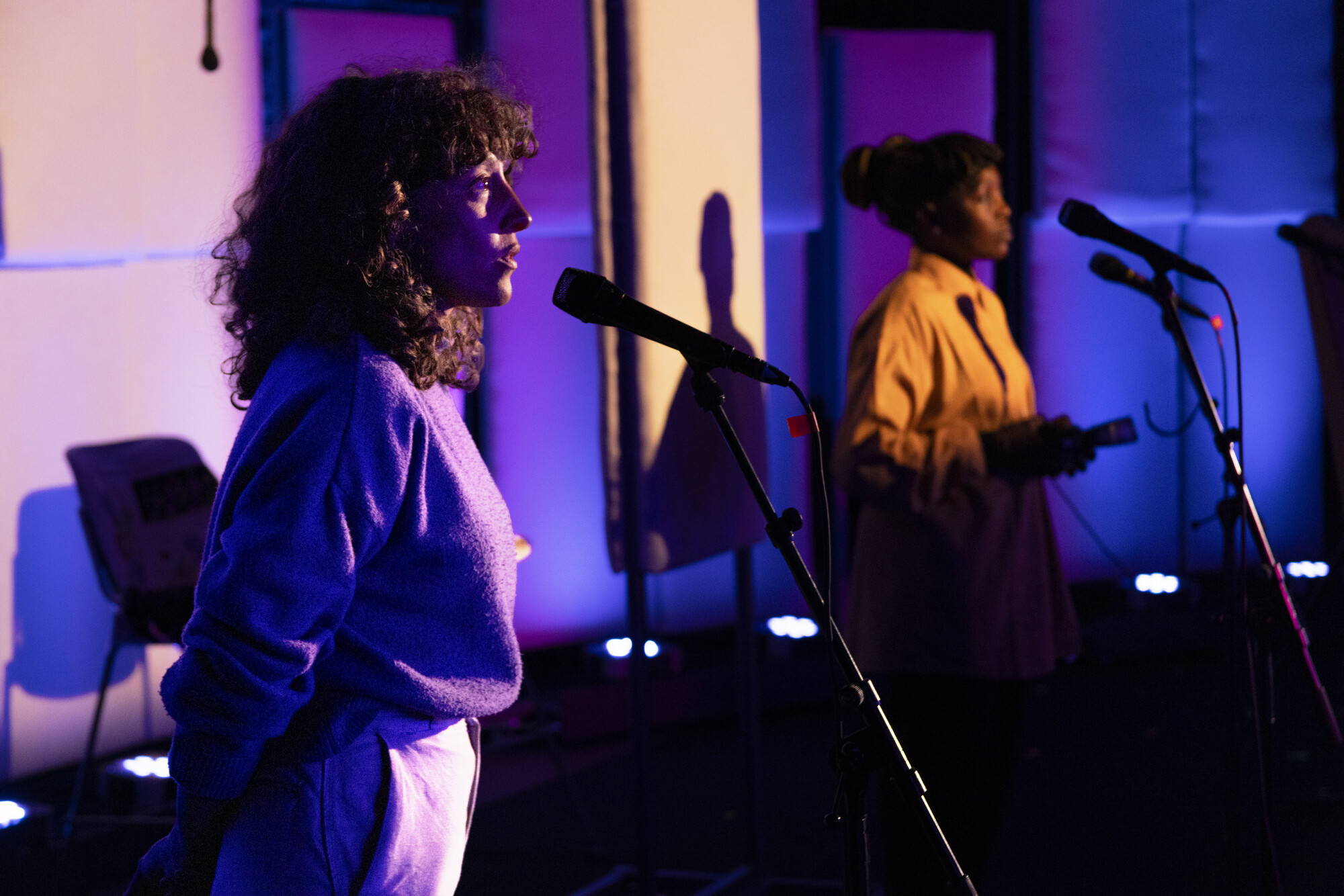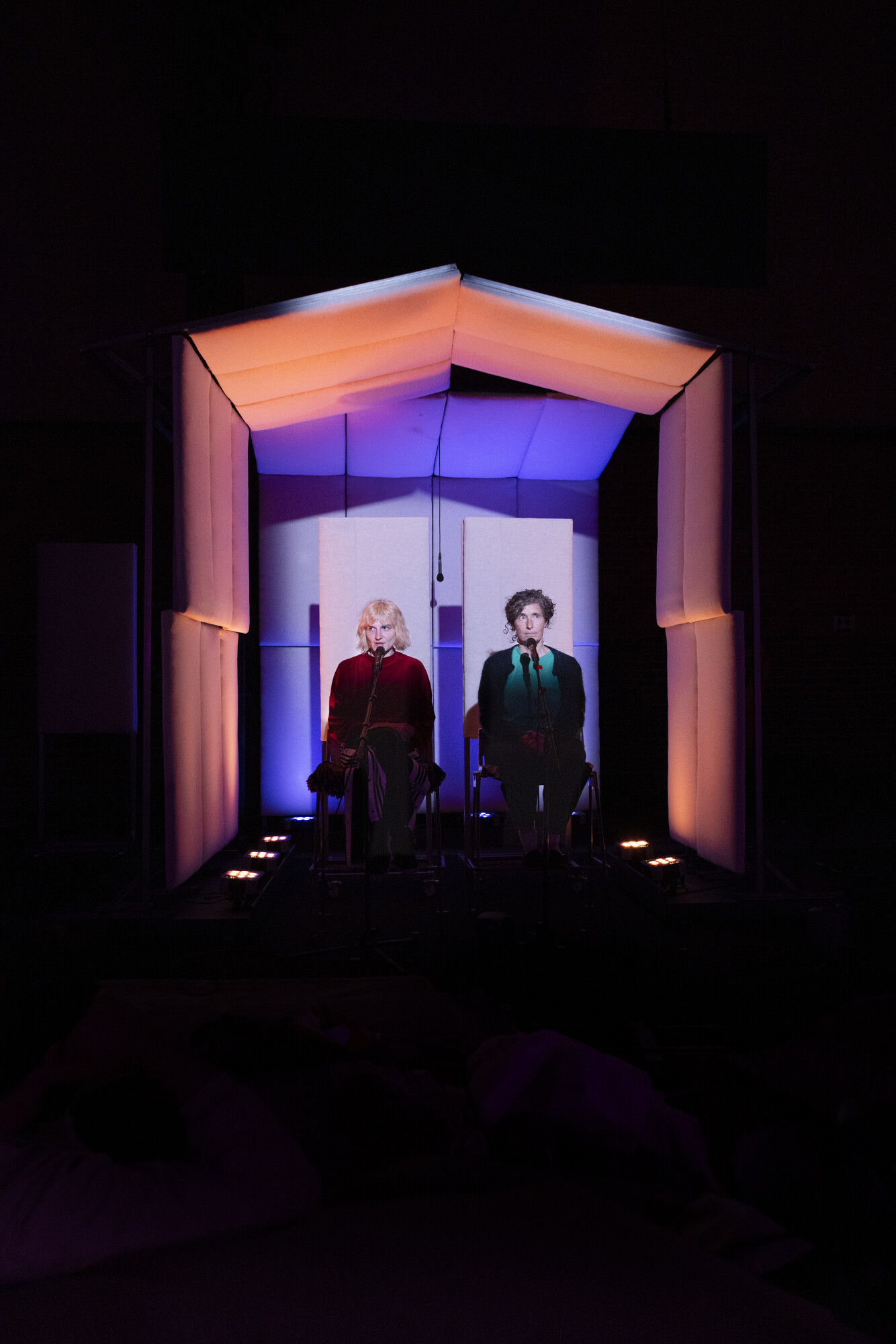 Il y a des choses que nous ne voyons qu’avec notre vision périphérique ; l’oreille flottante perçoit des voix que l’oreille attentive fuit. C’est dans ces interstices du silence que s’inscrit la performance théâtrale d’Adeline Rosenstein, Transformations Opéra Radio. Elle nous invite dans un salon acoustique aux multiples assises, une assemblée intime et fictive qui évoque un studio d’enregistrement et les lieux éphémères où un déchirement révolutionnaire peut se partager – la cabane, le lit, le passage.