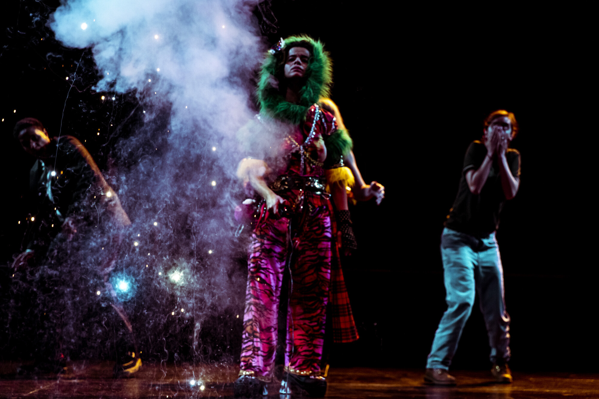 Les écrivain·es décident de mettre en scène quatre auteur·ices dans une situation miroir, qui cherchent leurs mots dans cette sensation d’asphyxie, s’allient et convoquent sur scène des personnages qui sont à la fois des doubles fictionnels, des avatars, des muses et des démons : une multitude hirsute, tendre et menaçante, comme un peuple qui manque, une insurrection qui vient.